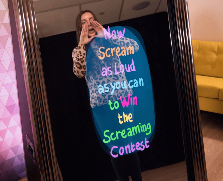 With a customizable workflow and layout builder, you can choose from a wide array of features to include in the interactive photo-taking experience. Choose to include voice guidance, gesture & movement detection, vibrant animations, displayed on the mirror, touch screen photo-signing, colorful and fully customizable emoji stamping, an interactive “Screaming Contest”, social games, and a colorful photo countdown.
